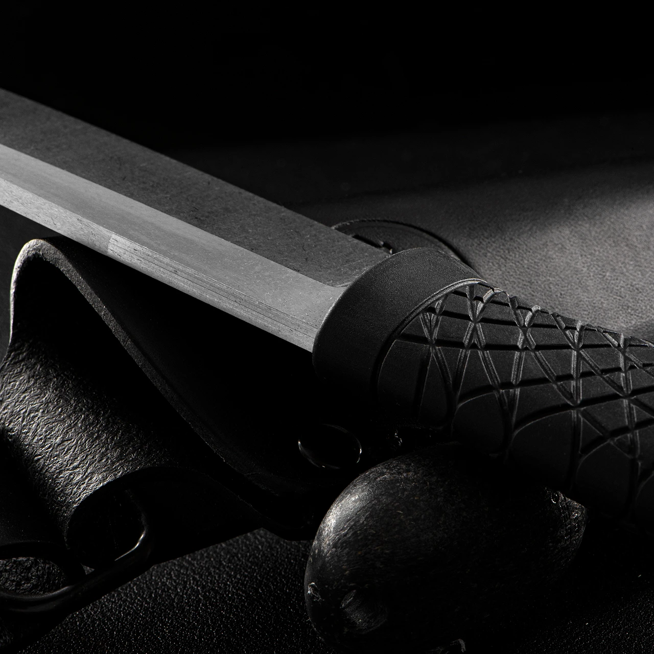 With the Boker Bronco these ambitious requirements were met in the following way: The CPM-3V was developed by Crucible Industries LLC – the specialist and worldwide market leader in powder metallurgical steels – to provide unprecedented shock-load tolerance, breakage elasticity and splinter resistance with a phenomenal edge retention and hardness of 62-63 HRC. These properties of the powder-metallurgical carbon steel were achieved, among other things, by a precisely adjusted chromium content of 7.5%. In this way, the positive properties of the alloying element Cr, such as the increase in wear resistance and hardenability, could be utilised while maintaining a fine microstructure. The universal wide drop-point blade with a high-set saber grind has always been the hunter’s preferred shape for both big and small game and is also suitable for both fine tasks such as stick feathering and for the more coarse, such as the obligatory batoning. The tang is continuous and protrudes a few millimetres from the end of the handle. This ensures maximum stability and the tang can also withstand powerful blows with a log or other object. A short part of the back of the blade forms sharp 90° edges on both sides for striking sparks from the included firestarter.