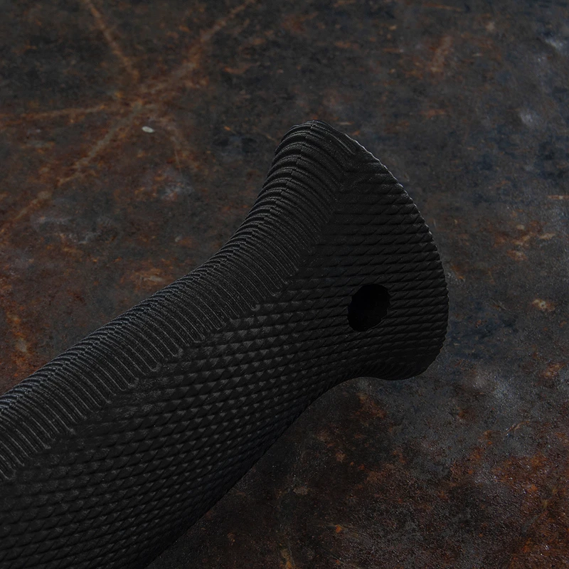 Featuring a rust resistant baked on matte black coating, the fully sharpened and expertly tempered 1055 Carbon Steel blade is safely and securely carried in a sturdy Cor-Ex sheath.