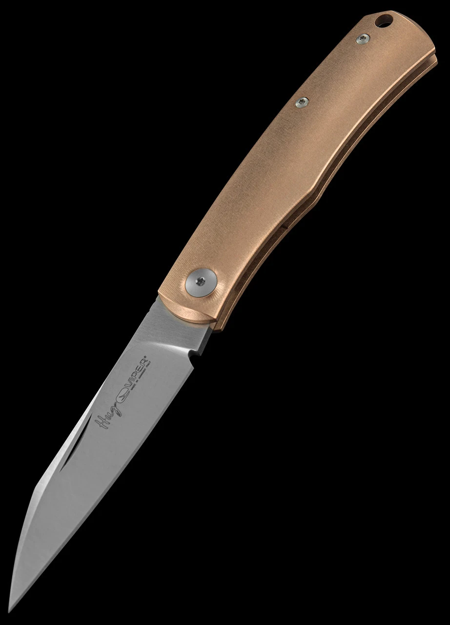 The Hug is a compact folding knife with a peaceful temperament, designed to go with its owner every day, always ready to offer extraordinary cutting qualities thanks to its ultra sharp Böhler M390 blade which is elegantly satin-finished. This is a very special folder with a heavyweight bronze handle.