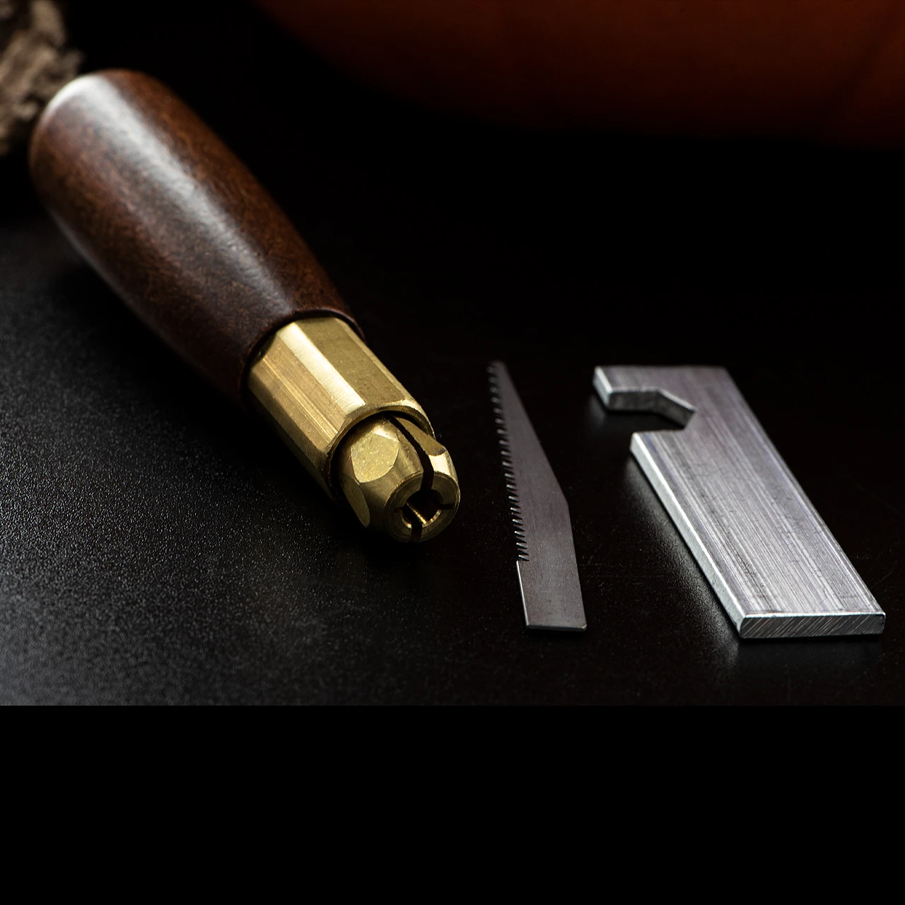 The carving set consists of a comfortable walnut handle with interchangeable double tempered high carbon (hollow ground) saw blades, enabling you to craft the exact shapes that you need.
